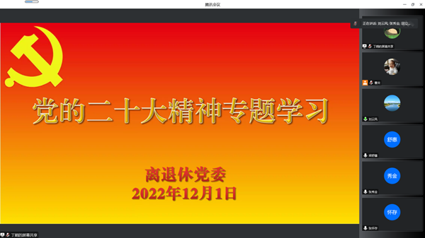 12月1日上午,離退休黨委召開(kāi)線上黨委擴大會(huì),學(xué)習貫徹黨的二十大精神。離退休黨委全體委員、離退休黨支部書記參加了會(huì)議。會(huì)議由離退休黨委書記、離退休工作處處長(cháng)劉雲風主持。
